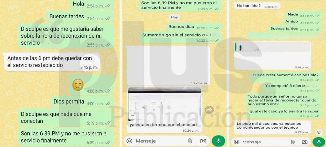 Hay otro agravante, la falta de seriedad por parte de la empresa, que, aunque se comprometió a través del WhatsApp que el mismo martes 30 de julio se restituiría el servicio, ocurrió un día después, posiblemente por la insistencia de la afectada, hasta las 5:15 de la tarde.
