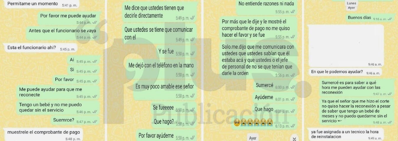 A pesar de que en la línea de WhatsApp que la entidad tiene para la atención al cliente le indican este procedimiento, el suspendedor se niega a reconectar argumentando que la empresa debía llamarlo para dar la orden. Escribió posteriormente la usuaria: «Y se fue. Me dejó con el teléfono en la mano. Es muy poco amable ese señor […]». Expresando posteriormente su angustia e impotencia con frases que ratifican su desazón, percibida cuando la afectada contactó a Plus Publicación. (Publicamos los chats autorizados por la usuaria).
