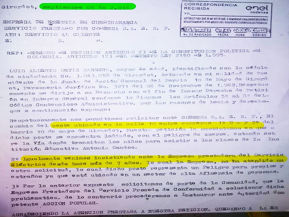Luis Alberto Ortiz, presidente de la Junta, dio a conocer los comunicados que, afirma él, ha entregado en tres oportunidades diferentes a la empresa Enel-Codensa solicitando la solución a esta situación, sin que haya recibido una respuesta satisfactoria, afirmó.