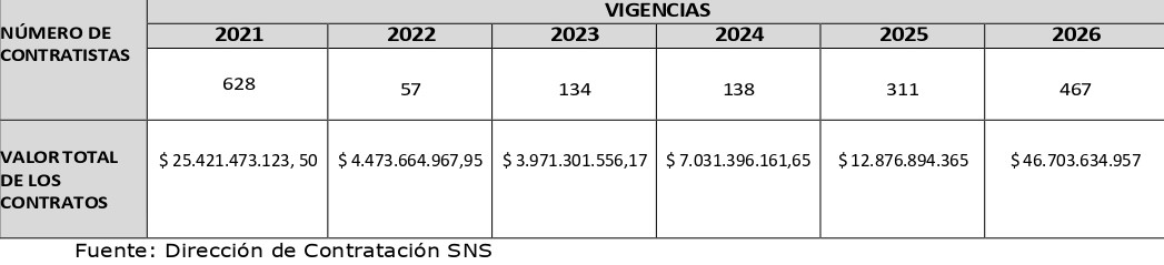 Como referencia adicional, en 2021 —antes de la entrada en vigor de esa reorganización y previo al cambio de gobierno— la Supersalud registró 628 contratistas, lo que evidencia que la cifra de 57 contratistas en 2022 no corresponde a un comportamiento estructural sino a una coyuntura administrativa.